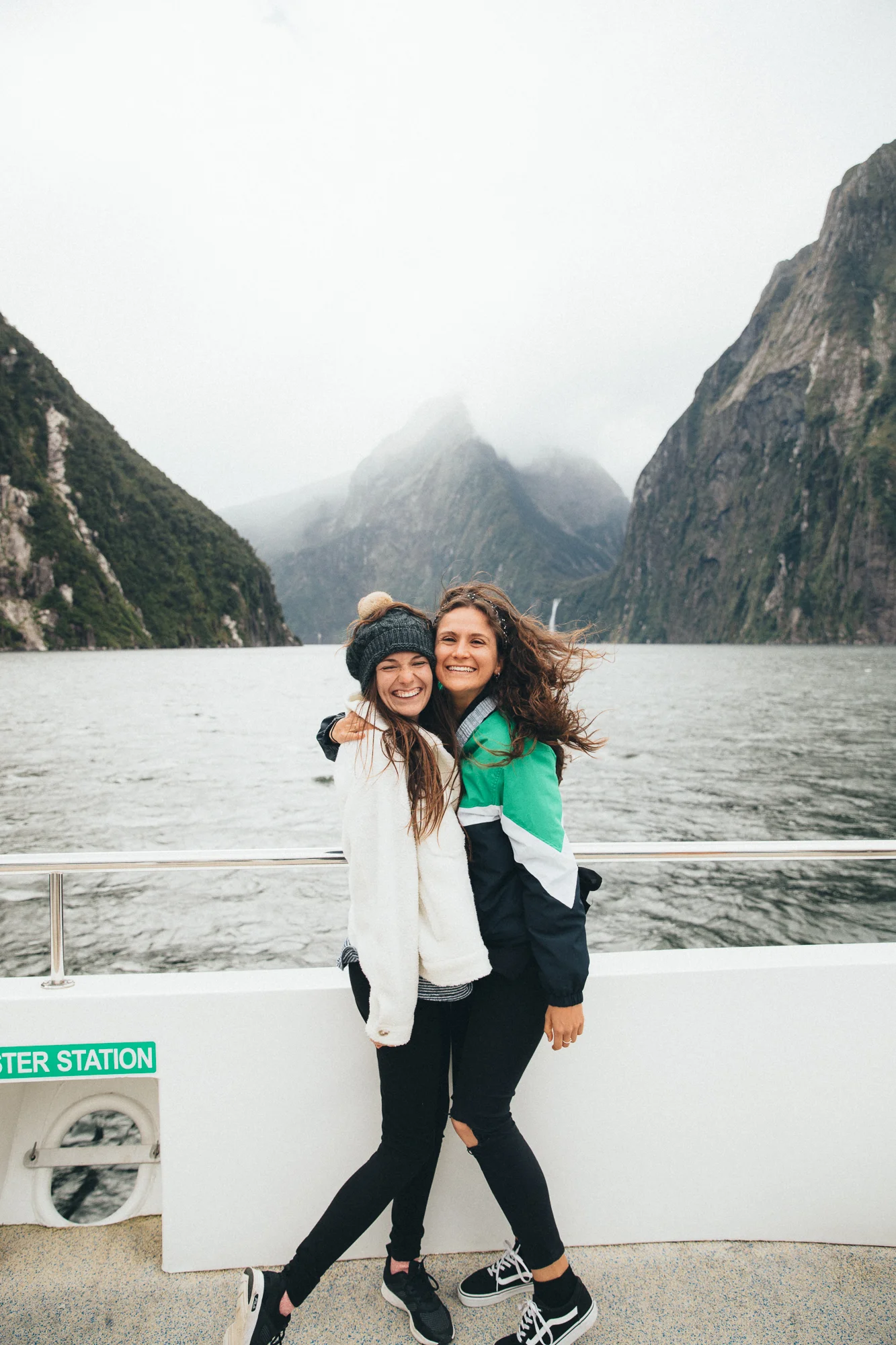 DAY 3- Next morning we woke up really early to make our 5am pickup. This morning we were going to start the day with a hot air balloon ride overlooking the countryside of Queenstown. After arriving, we helped inflate the hot air balloon with air before all loading into the basket and taking off! It was everyone's first time in a hot air balloon and the whole group was ecstatic. I can’t think of a better way to start your day then to be floating above the New Zealand countryside as the sun comes up. Once we landed, we helped pack up the big balloon and then shared pastries, champagne or sparkling apple juice with the group. I guess it’s a tradition to have champagne after a hot air balloon ride! After arriving back to our house at around 10am, we quickly packed up some snacks and our things for the day because we had to make our 3:35pm boat tour at the Milford Sound. Considering Queenstown is 4 hours away from the Milford Sound and we still wanted to stop for lunch, we all got comfy in our 12 passenger van and we had our lesson on Social Media and Building a Brand as we made our way to the Milford Sound. It was so fun to learn from all the girls about their experience with this and how to make social media a more positive place! After getting lunch in Te Anau, we made it to the beautiful Milford Sound and boarded our boat! The huge mountain ranges and waterfall falls going straight into the ocean made for beautiful views as we boated through the canyon. Alyssa, Beks, and I stayed on the outside deck of the boat as the boat inched toward one of the huge waterfalls drenching ourselves in the process. After finishing the boat tour, we piled back into our family bus and made the journey back to our house to get some rest.